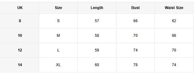 Size | S (8), M (10), L (12), XL (14) |